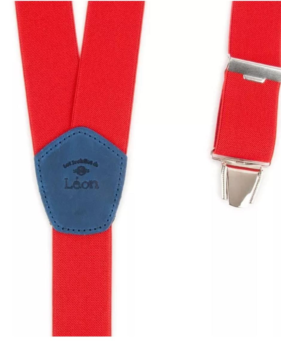 Ces bretelles se composent de bandes élastiques assemblées par un empiècement de cuir estampillé "Les Bretelles de Léon". Les bretelles sont livrées avec des pinces en acier inoxydables disposant d'un renfort en gomme pour ne pas marquer les vêtements.